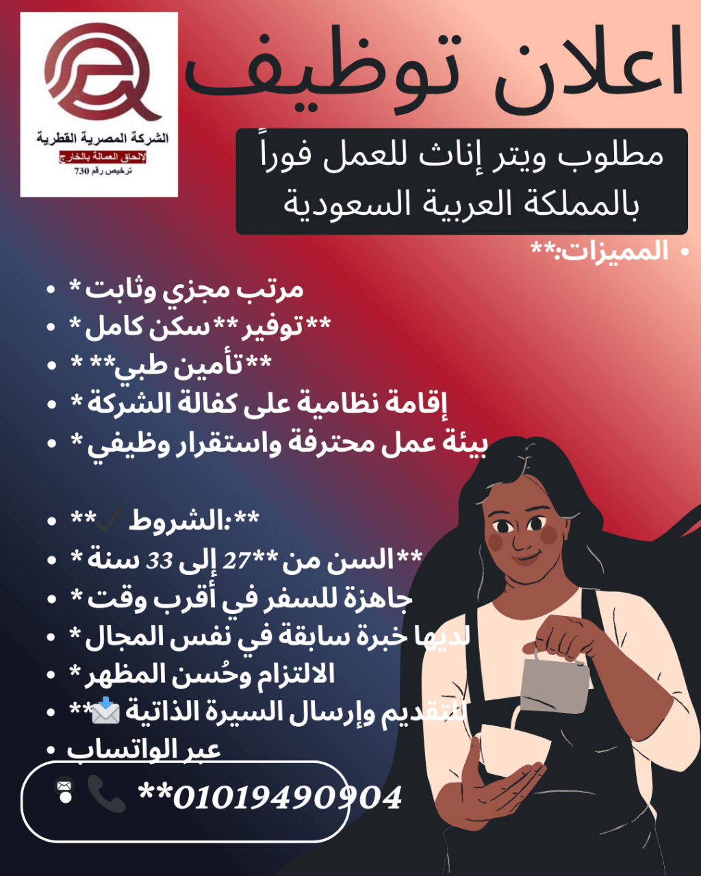 الى الشركات السعودية شركاء النجاح يبدأون من اختيار أفضل الكفاءات الشركة المصرية القطرية لالحاق العمالة بالخارج تقدم لكم كوادر محترفة في مختلف المجالات اختيار دقيق للمرشحين وفق معاييركم سرعة في انهاء التأشيرات واجراءات السفر متابعة مستمرة لضمان نجاح الموظف في بيئة العمل نوفر لكم خبرات حقيقية جاهزة للعمل فورا ونلتزم بتقديم أفضل المرشحين بما يناسب احتياجاتكم. مسؤولا لتسويق اشرقت مرسي