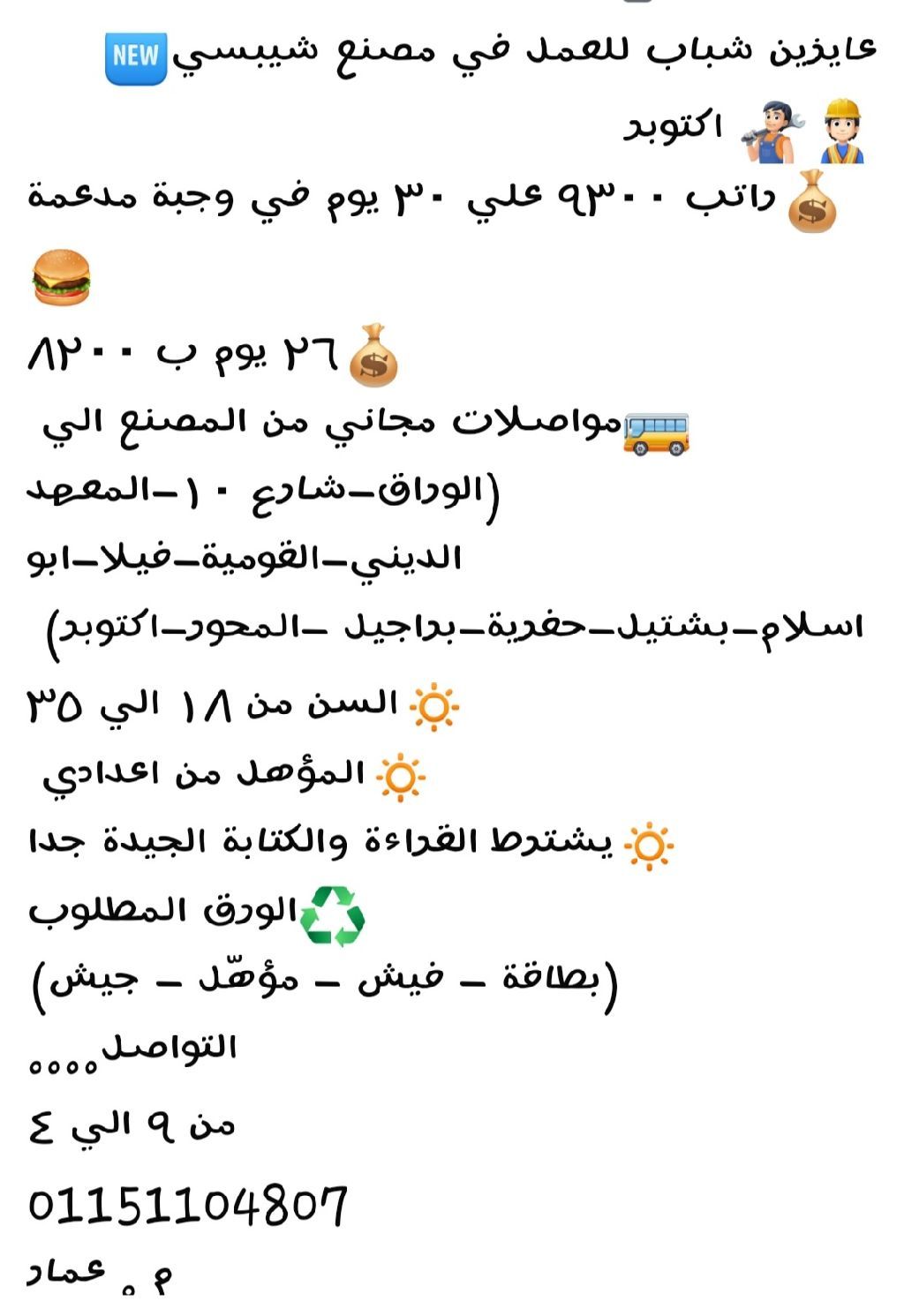 عايزين شباب للعمل في مصنع شيبسي أكتوبر راتب 9300 علي 30 يوم في وجبة مدعمة 26 يوم ب 8200 مواصلات مجاني من المصنع الى (الوراق - شارع 10 - المعهد الديني - القومية - فيلا - أبو اسلام - بشتيل - حفرية - برجل - المحور - أكتوبر) السن من 18 الى 35 المؤهل من اعدادي يشترط القراءة والكتابة الجيدة جدا الورق المطلوب (بطاقة - فيش - مؤهل - جيش) التواصل