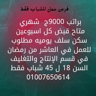 براتب 9000ج + سكن سلف يوميه مطلوب للعمل في العاشر في قسم الانتاج والتغليف السن 18 ل 45 شباب