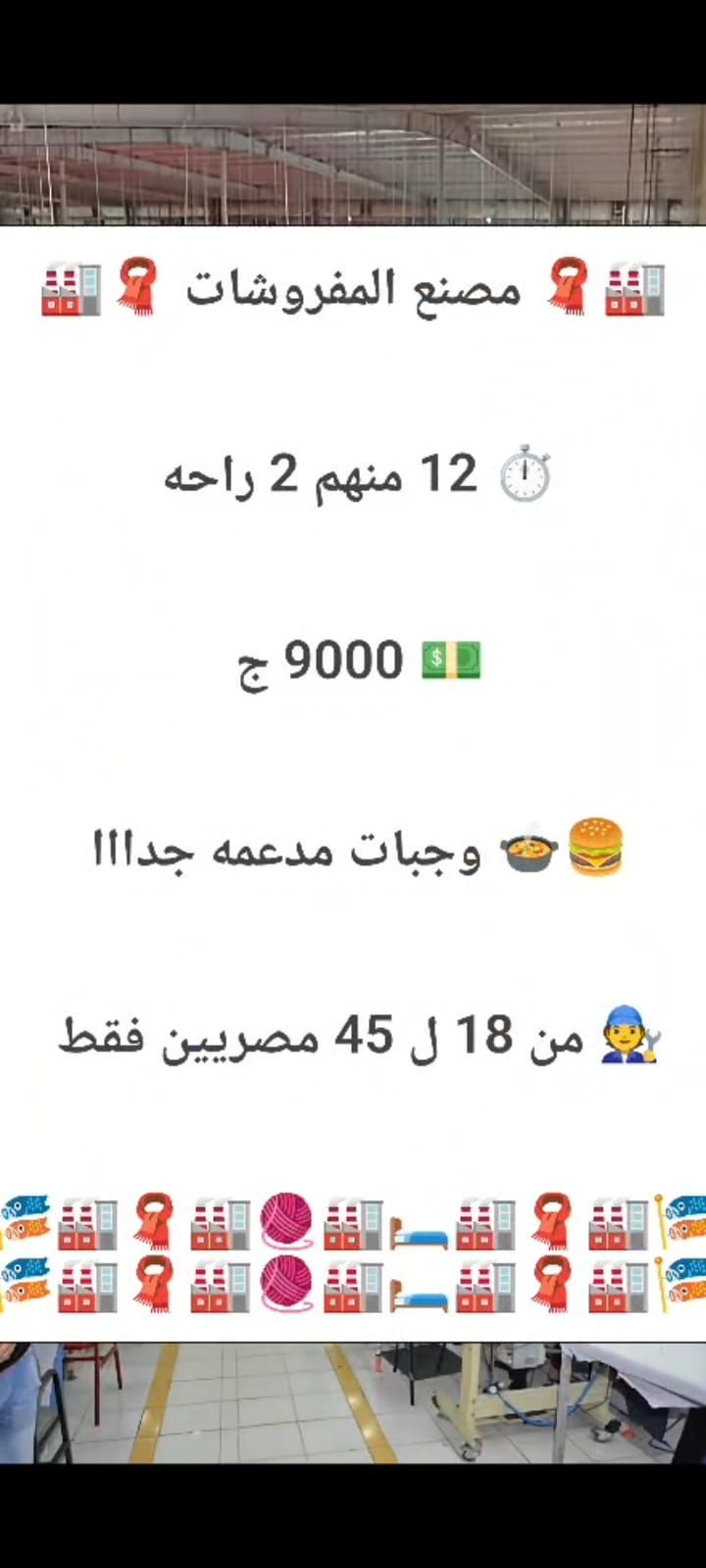 مطلوب شباب لمصنع جديد في العاشر من رمضان مصنع مفروشات ببطاقتك واستلم شغلك سكن مفروش كامل مجانا وجبتين كل يوم مجانا مرتب 9000 جنيه العمل 12 ساعة منهم 2 راحة السن من 18 الى 45 مصريين