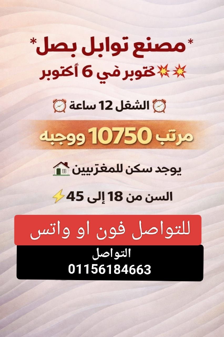 مطلوب عمال شباب مصنع توابل البصل في السادس من أكتوبر بمرتب 10750 متوفر وجبة وسكن السن من 20 الى 43