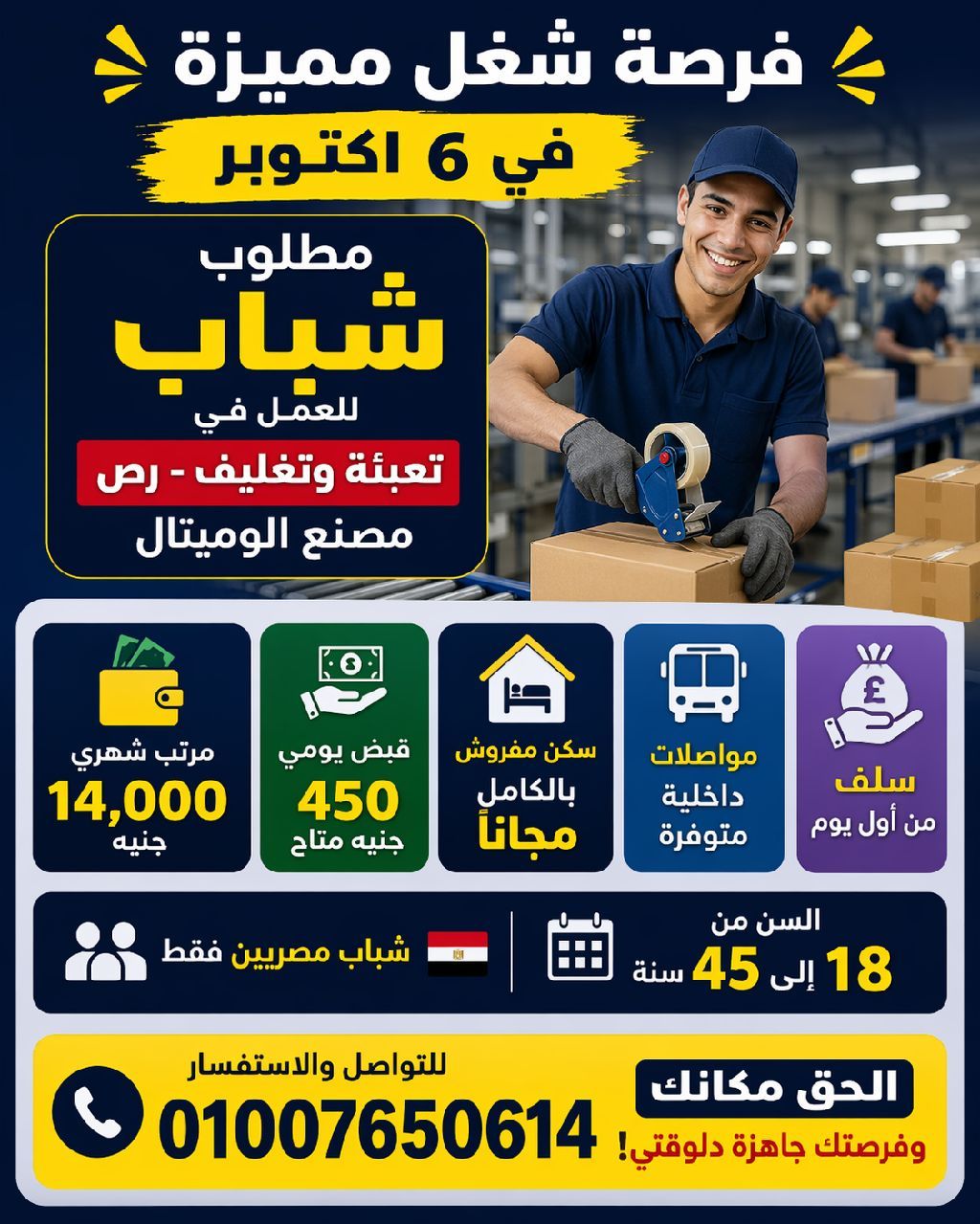 فرصة شغل مميزة في 6 أكتوبر مطلوب شباب للعمل (تعبئة وتغليف - رص) مصنع الوميتال مرتب شهري يصل الى 14000 جنيه قبض يومي 450 جنيه متاح سكن مفروش بالكامل مجانا مواصلات داخلية سلف من أول يوم السن من 18 الى 45 سنة شباب مصريين فقط للتواصل ألحق مكانك وفرصتك جاهزة دلوقتي