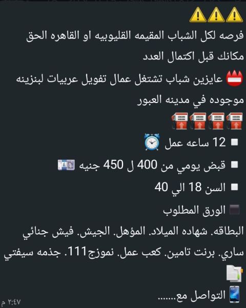 فرصه لكل شباب المقيمة القليوبية أو القاهرة ألحق مكانك عايزين شاب يشتغل عامل تفويل عربيات لبنزينه موجودة في مدينة العبور 12 ساعة عمل قبض يومي من 400 ل 450 السن 21 الى 4 البطاقة. شهادة الميلاد. المؤهل. الجيش. فيش جنائي ساري برنت تأمين. كعب عمل. نم وزج 111. جزمه سيفتي التواصل مع