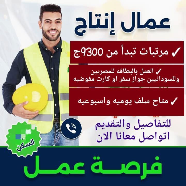 مطلوب عمال شباب للعمل فورا - بمدينة السادات (المنوفية) الوظيفة في مصنع تغليف أواني زجاجية العمل متاح للشباب فقط عدد ساعات العمل 12 ساعة يوميا (بينهم ساعة ونصف راحة) ووجبتين بروتين يومية المرتب الشهري 8000 جنيه يشترط وجود بطاقة شخصية سارية السن المطلوب من 16 الى 58 سنة فرص محدودة - التقديم سريعا للتواصل