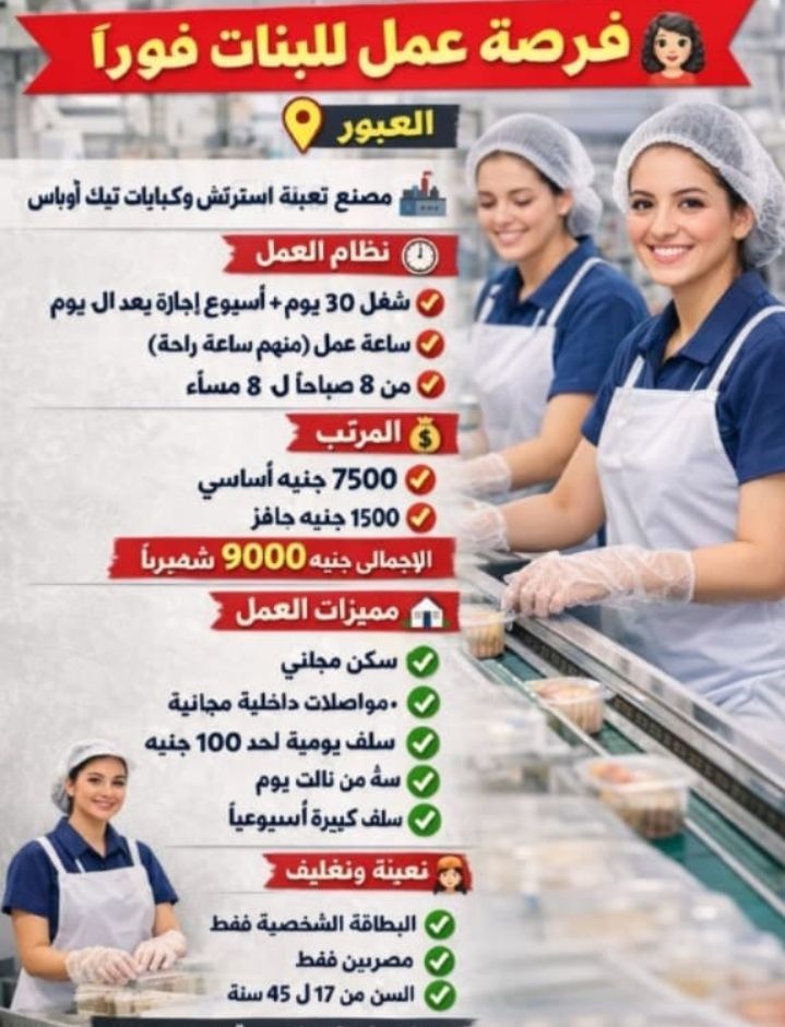 شغل عاملات مصنع بالعبور ويوجد سكن للبنات) مطلوب عاملات للعمل عاملات تعبئة وتغليف في مصنع استريتش وكبأيات تك أوي وأكياس بمدينة العبور العمل 12 ساعة منهم ساعة راحة من الساعة 8 ص الى 8م براتب شهري 9000 ألاف جنيه بحافز الانتظام سلف يومية وأسبوعية كبيرة يوجد سكن مجاني مستقل للبنات مواصلات داخلية مجانية ونقبل بدون مؤهل وباي مؤهل والسن من 17 الى 45 سنة مصريات فقط استلام الشغ