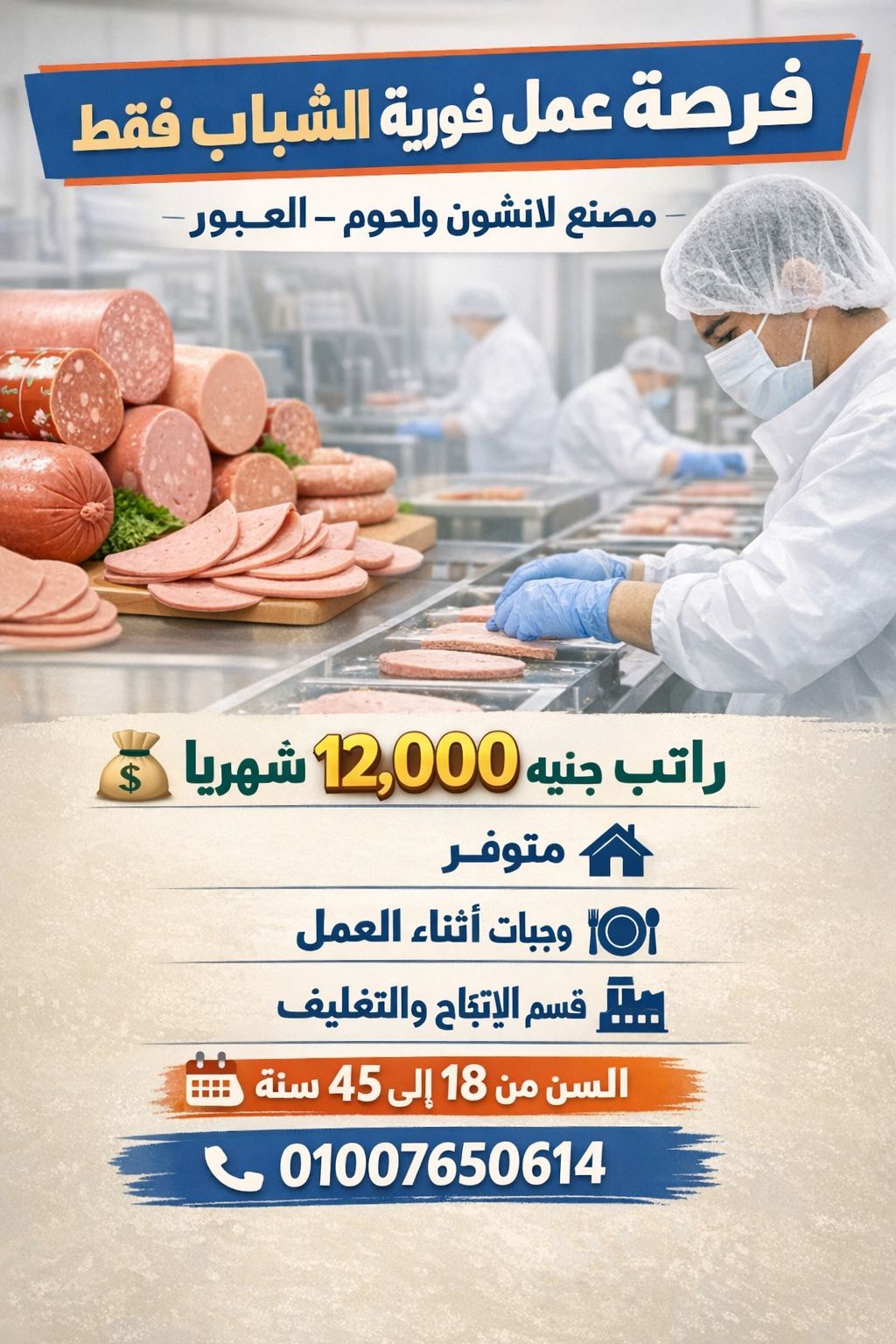 براتب 12000ج + سكن + وجبات مطلوب للعمل في العبور في قسم الانتاج والتغليف السن 18 ل 45 شباب
