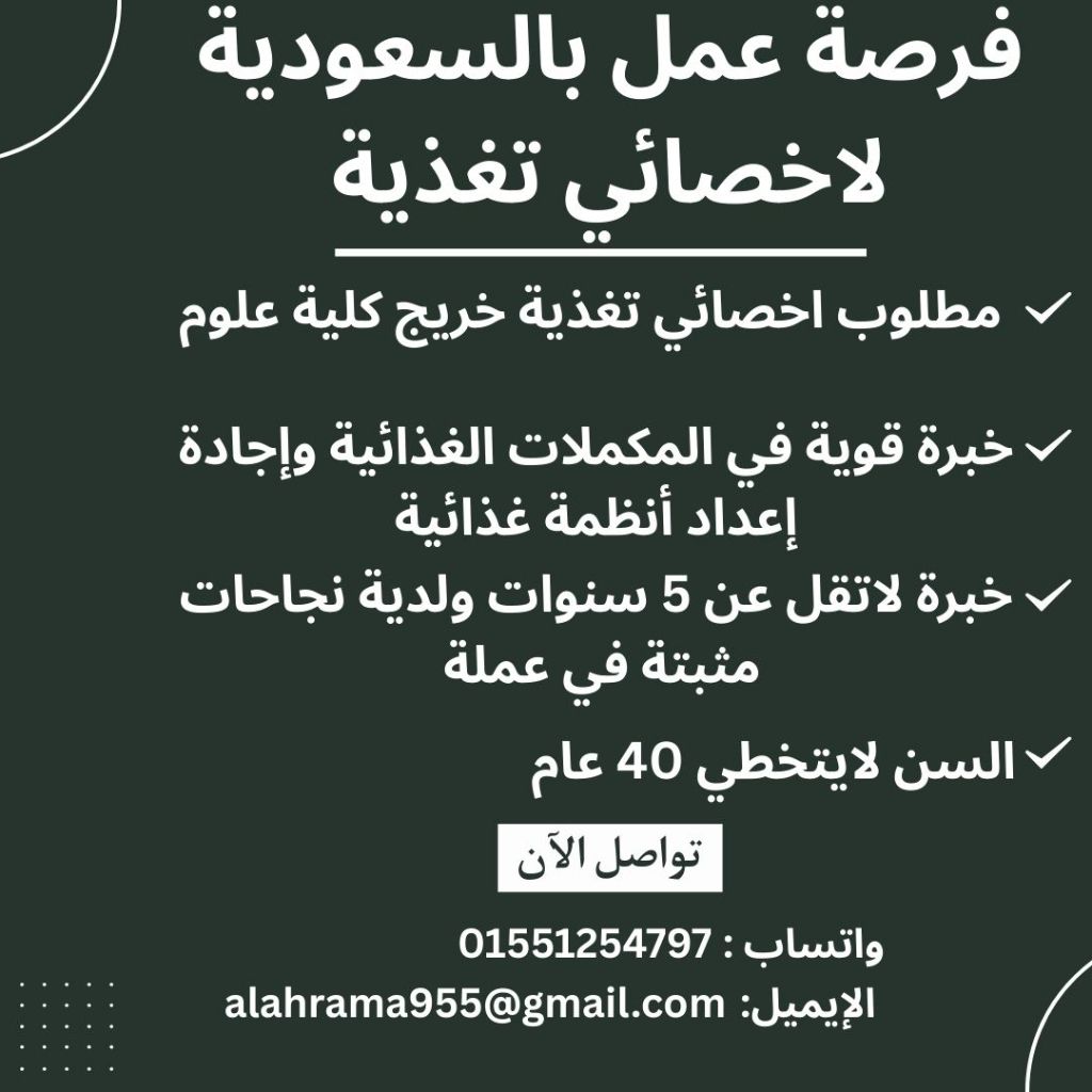 مطلوب - فرصة عمل - في السعودية - لأخصائي - تغذية 1 - مطلوب أخصائي تغذية خريج كلية علوم 2 - خبرة قوية في المكملات الغذائية واجادة اعداد أنظمة غذائية 3 - خبرة لا تقل عن 5 سنوات ولدية نجاحات مثبتة في عملة 4 - السن لا يتخطى 40 عاما