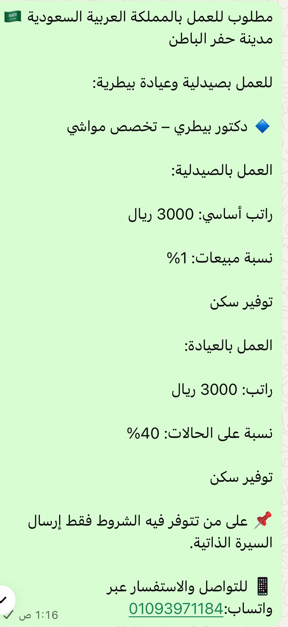 مطلوب للعمل بالمملكة العربية السعودية مدينة حفر الباطن للعمل بصيدلية وعيادة بيطرية دكتور بيطري - تخصص مواشي العمل بالصيدلية راتب أساسي 3000 ريال نسبة مبيعات 1% توفير سكن العمل بالعيادة راتب 3000 ريال نسبة على الحالات 40% توفير سكن على من تتوفر فيه الشروط فقط إرسال السيرة الذاتية. للتواصل والاستفسار عبر