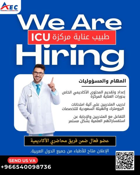 مطلوب فورا بأكاديمية التعليم المتطور AEC أخصائي عناية مركزة للعمل كمحاضر اونلاين أو حضوري بمقر الأكاديمية يكون لدية المقدرة تحضير وتقديم دورة تدريبية لاجتياز اختبار الهيئة السعودية للتخصصات الصحية Critical Care Medicine للتقديم إرسال السيرة الذاتية مع شهادة اجتياز اختبار الهيئة للتخصص علي