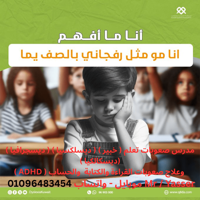 مدرس صعوبات تعلم (خبير) ديسلكسيا) ديسجرافيا) ديسكا لكيا) ADHD) وعلاج صعوبات القراءة والكتابة والحساب واتساب القاهرة مصر 01096483454 موبايل - واتساب Mr / Yasser مدرس خصوصي (ماجستير) في صعوبات التعلم وعسر القراءة والكتابة والحسابات (خبرة أكثر من 15 سنة داخل مصر وخارجها) خبير (ديسلكسيا) ديسجرافيا) ديسكا لكيا) ADHD) صعوبات التعلم الناتجة عن ضعف الذاكرة - أو الشرود الذهني
