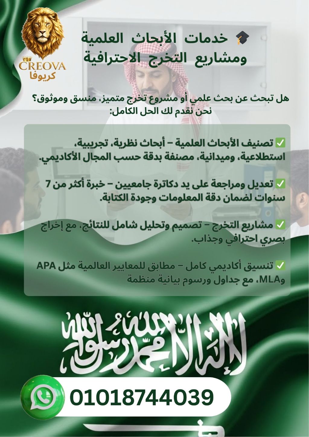 هل عندك بحث علمي أو مشروع تخرج وتحتاج انجازه باحترافية نحن نساعدك في اعداد الأبحاث العلمية ومشاريع التخرج باشراف دكاترة جامعيين بخبرة تزيد عن 7 سنوات، مع دقة في المضمون وجودة في الاخراج الأكاديمي