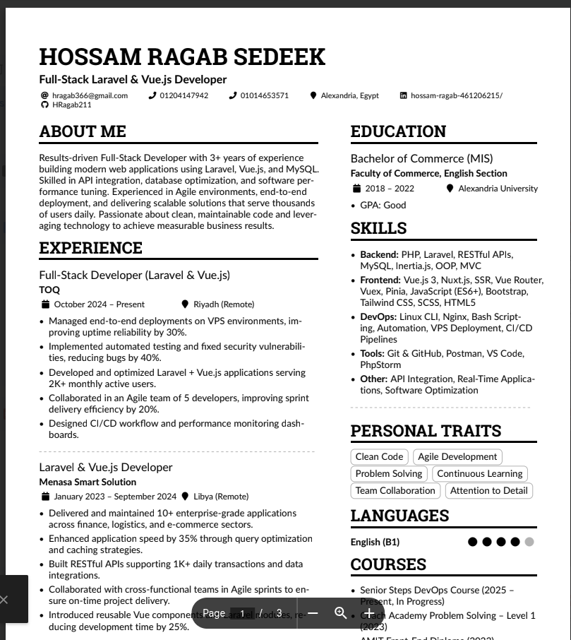 مطور Full Stack Laravel وVue. js بخبرة 3 سنوات في تطوير الويب داخل السعودية ومصر والكويت والامارات. ابحث عن فرصة عمل عن بعد ومتاح للسفر والبدء فورا