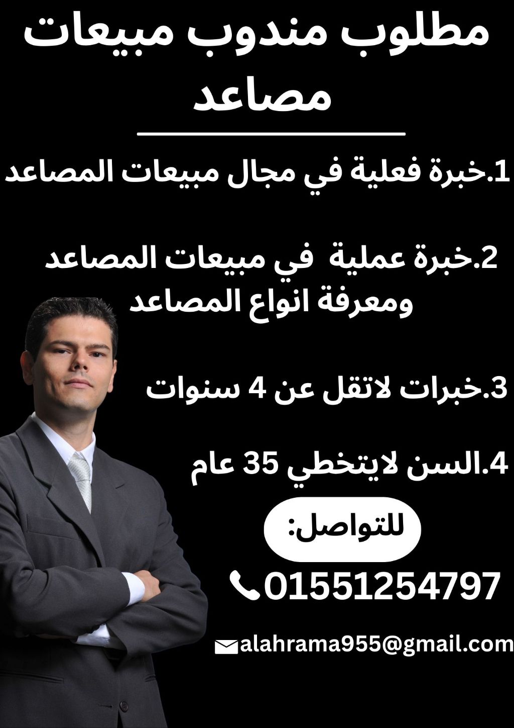 مطلوب - مندوب - مبيعات - مصاعد 1 - خبرة فعلية في مجال مبيعات المصاعد 2 - خبرة عملية في مبيعات المصاعد ومعرفة أنواع المصاعد 3 - خبرة لا تقل عن 3 سنوات 4 - السن لا يتخطى 35 عاما