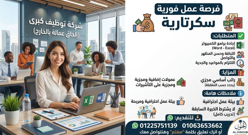 مطلوب سكرتارية فورا لشركة توظيف كبرى (الحاق عمالة بالخارج) للعمل سكرتارية اجادة التعامل مع برامج الكمبيوتر الأساسية (Word - Excel) اللباقة وحسن المظهر والقدرة على التواصل الالتزام بالمواعيد والجدية في العمل راتب أساسي مجزي يحدد حسب المقابلة عمولات اضافية ومجزية على تحقيق التأشيرة. بيئة عمل احترافية ومريحة لا يشترط الخبرة السابقة (تدريب كامل للمقبولين) عنوان مقر العمل (12 شارع الدكتور عرفة خلف فندق