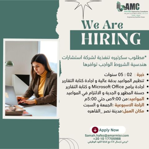 مطلوب سكرتيرة لشركة كبرى في القاهرة - مدينة نصر المواعيد من 9:00 الى 5:00 الاجازة (جمعة وسبت) يرجى ارسال CV