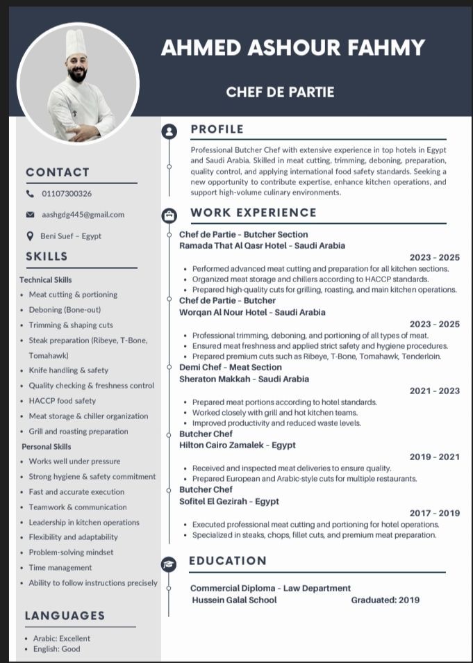 أحمد عاشور شيف جزار ومشاوي ديبارتي موجود في مصر ابحث عن وظيفة في الامارات دبي أبو ظبي