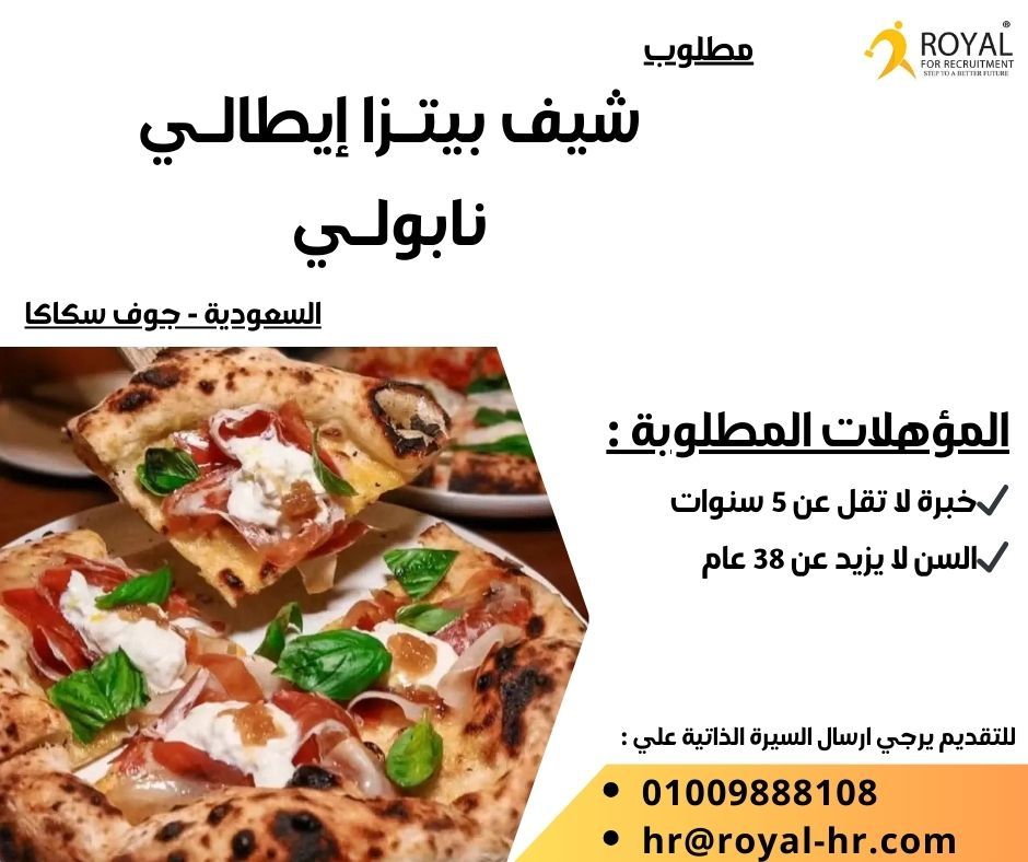 مطلوب لكبرى المطاعم التابعه لشركة رويال في مصر (شيف بيتزا إيطالي نابولي) للعمل بكبرى المطاعم بالخارج - المؤهلات المطلوبة خبرة لا تقل عن 5 سنوات سن لا يزيد عن 38 عام - الامتيازات المتوفره سكن إقامة تأمين طبي انتقالات - للتقديم يرجى إرسال السيرة الذاتية + نماذج عمل