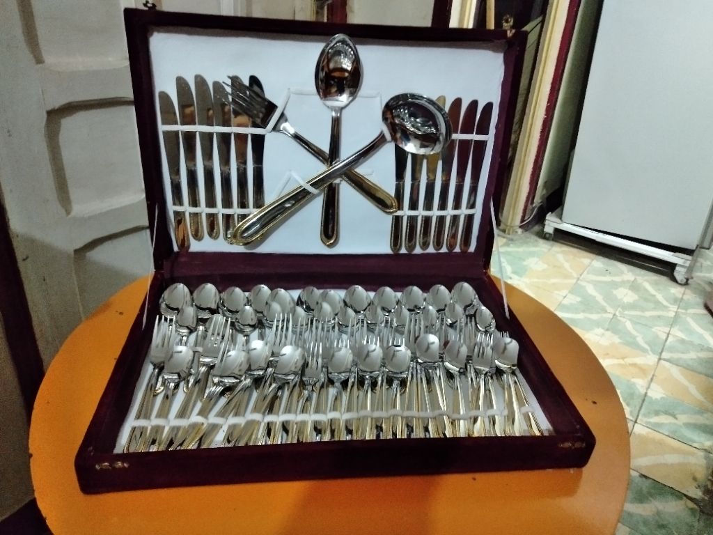 شنطة معا لق جديدة كاملة للبيع تحتوي علي عدد 75 قطعة 1 - عدد 12 ملعقة كبيرة 2 - عدد 12 ملعقة صغيرة 3 - عدد 12 ملعقة ايس كريم 4 - عدد 12 شوكة كبيرة 5 - عدد 12 شوكة صغيرة 6 - عدد 12 سكينة كبيرة 7 - عدد واحد ملعقة غرف 8 - عدد واحد كبشة غرف 9 - عدد واحد شوكة غرف العنوان عين شمس الشرقية - القاهرة - السعر 2000
