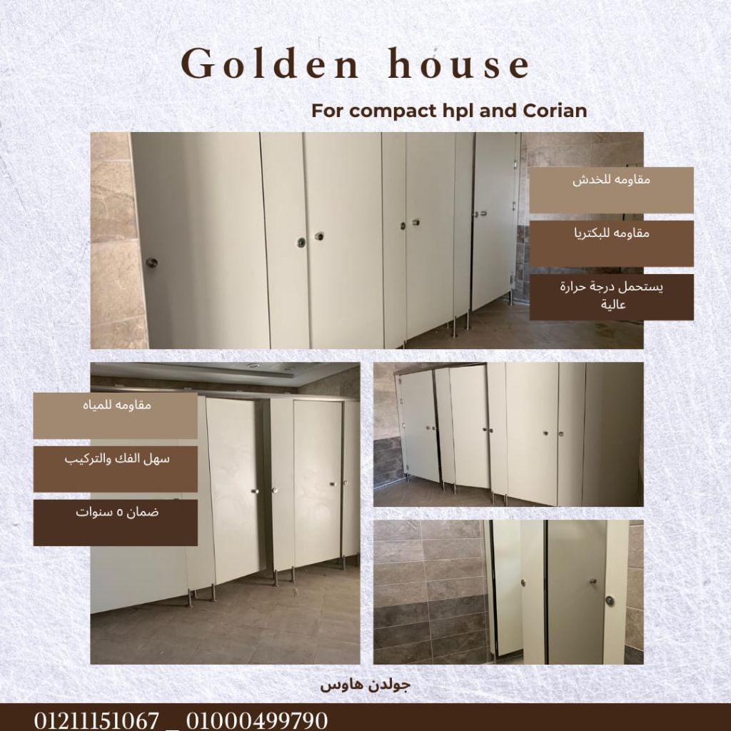 شركة جولدن هاوس المتخصصة في مجال استيراد وتصنيع وتوريد وتركيب قواطع حمامات كومباكت - HPL كومباكت HPL صيني كومباكت HPL هندي كوريان - رخام - صناعي استخدامات كومباكت HPL قواطع - حمامات وأبواب وفواصل الحمامات. بارتشنات وفواصل - الم بأول قرص ترابيزات - المطاعم والكافيهات والنوادي دواليب / لوكرز في النوادي والمستشفيات والمصانع والمدارس والشركات والمطاعم مميزات الكومباكت