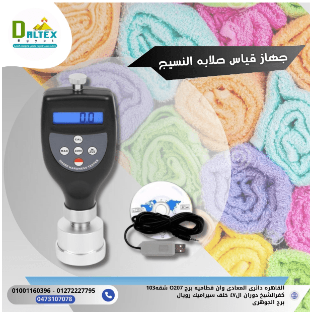 جهاز قياس صلابة النسيج - يستخدم لقياس صلابة بكرات النسيج وعبوات الصبغ - يعتمد الم بدأ المستخدم لقياس صلابة النسيج على قياس قوة مقاومة اختراق الكرة للبكرة تحت حمل زنبركي معروف - مسبار قابل للتحويل - قطر الطرف المنحني للم سبار الم كوك أقل من أو يساوي 400م، والطرف المسطح للم سبار مناسب للم كوك الذي يبلغ قطره أكبر من 400م. اجهزة قياس علمية، صلابة، نسيج، قوة، دالتكس ايجيبت، يمكنكم الاتصال بنا