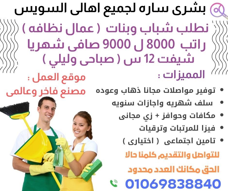 بدون رسوم والتعيين بالبطاقة محتاج عمال نظافة لمضنع في السويس راتب 8000 ل 9000 صافي شباب وبنات طبيعة العمل نظافة شيفت 12 ساعة مكان العمل السويس منطقة الأدبيه عنوان التقديم الأربعين في السويس نوفر مواصلات وسلف وزس وترقيات وحوافز للتواصل كلمنى خالا