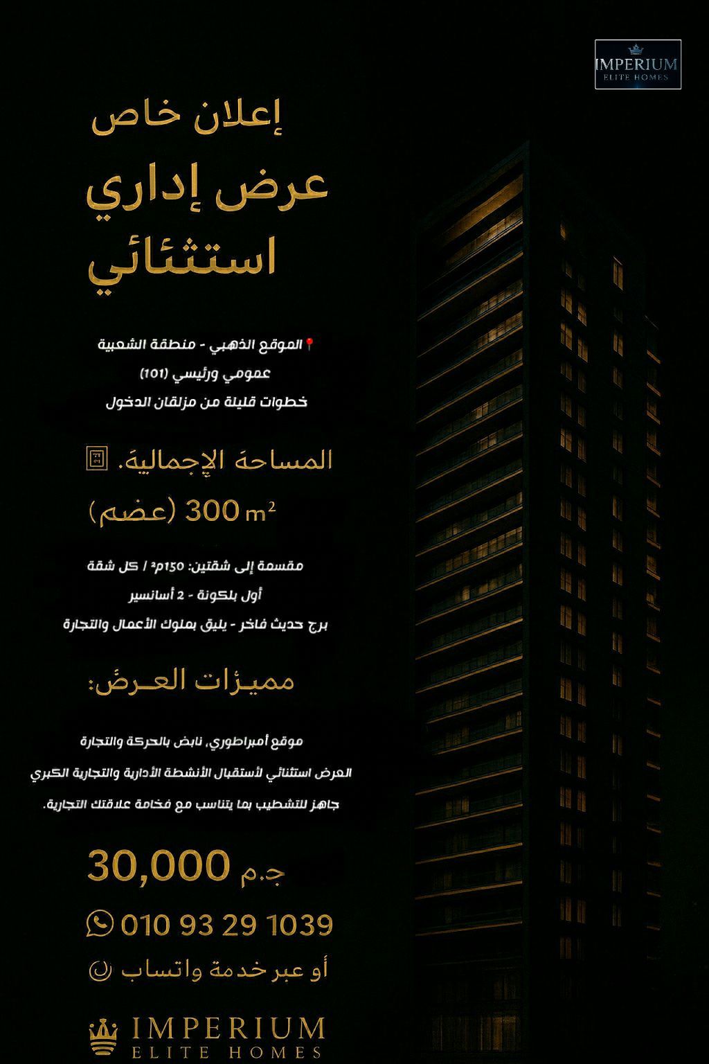 اعلان خاص - عرض اداري وتجاري استثنائي، للنخبة - ورجال الأعمال والشركات - للإيجار الاداري، والتجاري الراقي، الموقع أرقى أحياء منطقة الشعبية - مدينة المحلة الكبرى - الموقع الذهبي، العمومي والرئيسي. على بعد 10 خطوات فقط - من مزلقان دخول الشعبية أول بلكونه - داخل برج حديث فاخر يليق بملوك الأعمال والتجارة - المساحة 300م (عضم / مقسمة الى شقتين - كل واحدة 150م/ موقع أمبراطوري نابض بالحركة والتجارة
