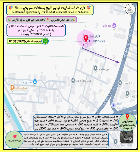 فرصة استثمارية أرض للبيع بمنطقة سبر باي طنطا داخل الحيز العمراني وكافة المرافق المساحة الكلية 270م - صافي المساحة 208م واجهة 15.5م على شارع 8م (السعر 3750000 جنيه) WhatsApp موقع الأرض بالنسبة للمواقع المحيطة شركة الكهرباء 250م طريق مصر الاسكندرية الزراعي 340م معهد الحاسب الآلي 400م الإزاعة 310م مصنع العيا شيء 450م الأحوال المدنية 490م إستاد طنطا والكورنيش 550م كلية الشريعة 300م مستشفى