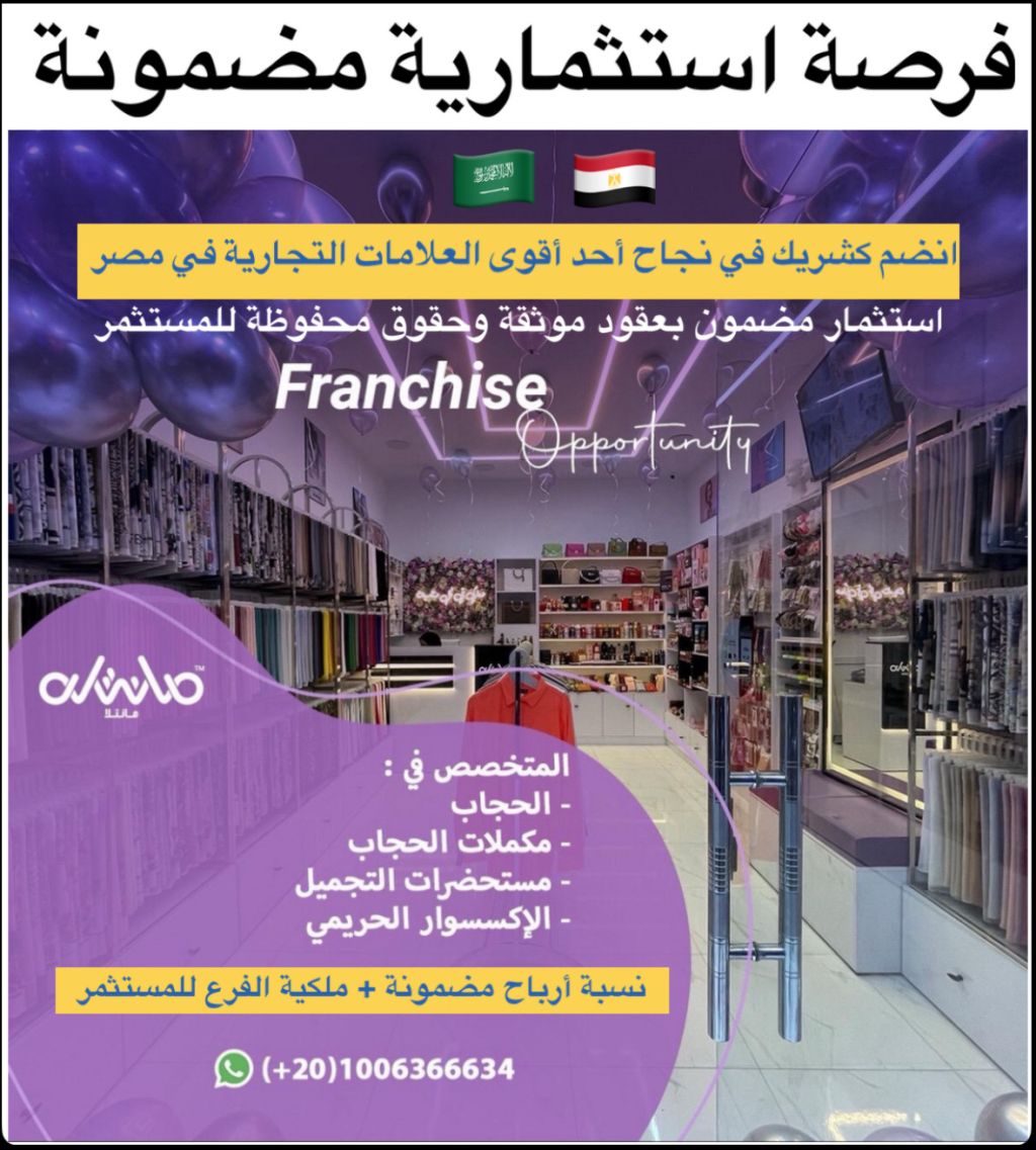 فرصة استثمارية حقيقية في مجال الملابس الجاهزة والحجاب النسائي تحت علامة تجارية مسجلة - مانتلا (Mantella) الحجاب خبرة منذ عام 1999 في التصنيع والتجارة لدي 3 فروع قائمين فعليا تحظي بثقة وسمعة ممتازة. الهدف من الشراكة تمويل وتوسعة النشاط بانشاء مصنع متكامل وخطوط انتاج بهدف التصدير للأسواق الخارجية وانشاء فروع جديدة للبيع بالجملة والتجزئة اذا كنت مستثمر لدية رغبة في تطوير الأعمال الناجحة تواصل