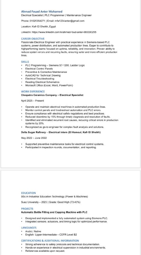 أنا أخصائي كهرباء (قوى وآلات كهربائية) بخبرة 6 شهور في مجال الصيانة والتشغيل، مع خبرة عملية في أنظمة أل PLC والتحكم الآلي. خبرة في دوائر القوى والتحكم معرفة جيدة بأنظمة ستار دلتا وسوفت ستار تر القدرة على التعامل مع خطوط الانتاج والمعدات الكهربائية
