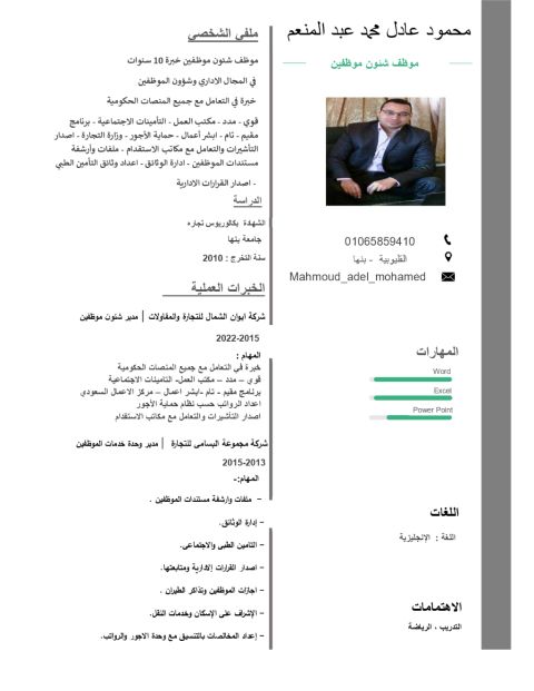 موظف شؤون موظفين خبرة 10 سنوات في المجال الاداري وشؤون الموظفين خبرة في التعامل مع جميع المنصات الحكومية قوي - مدد - مكتب العمل - التأمينات الاجتماعية - برنامج مقيم - تام - ابشر أعمال - حماية الأجور - وزارة التجارة - اصدار التأشيرات والتعامل مع مكاتب الاستقدام - ملفات وأرشفة مستندات الموظفين - ادارة الوثائق - اعداد وثائق التأمين الطبي - اصدار القرارات الادارية
