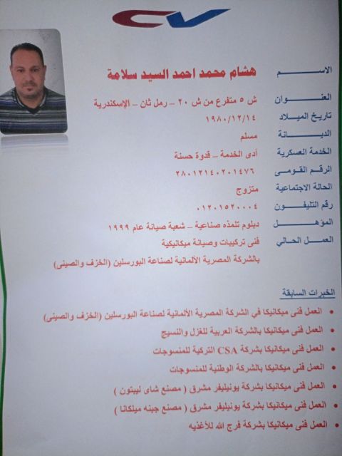 فني صيانة ميكانيكية خبرة في فحص جميع المعدات الميكانيكية والمواتير وتشخيص الأعطال وإصلاحها القدرة علي فحص مستوى السوائل والمكونات المتحركه للمعدات واستبدال الأجزاء التالفه مثل رومان البلي والكراسي الخاصة بها وصيانة السيور الناقله وتصنيعها وصيانة الجر وبكسات الناقله للحركة وصيانة طلمبات المياه وألفا كيوم وطلمبات الديفرام التي تعمل بالهواء أجيد أعمال الورش الصاروخ والمتقاب والحام والتركيبات والبراده
