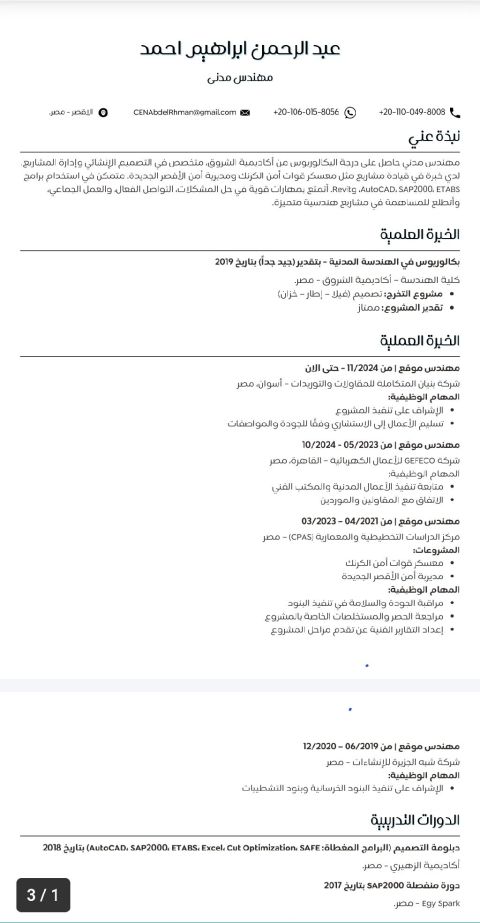 مهتم بفرصه سفر للخارج عبدالرحمن إبراهيم مهندس مدني خريج 2019 خبرة في أعمال الإنشاءات والتشطيبات مع عمل حصر ومستخلصات حاصل علي دبلومه تصميم انشائي ودوره أمن وسلامه مهنية OSHA مهندس موقع في العاصمة الادارية ومدينة الجلالة واستشاري مدة سنتين بالاقصر بمشروعين معسكر قوات، ومديرية أمن بالاقصر اعمل حاليا مهندس موقع جامعة الاقصر الجديدة
