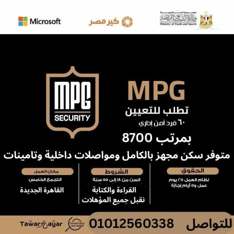 استلم وظيفتك فورا بمرتب يصل 8700 جنيه تعلن شركة MPG للأمن والحراسة عن فتح باب التعيين (تعيين فوري) لأفراد أمن بكبرى الكمبوندات والمولات (التجمع الخامس - القاهرة الجديدة) تفاصيل الرواتب 7500 (نظام 25 يوم عمل + 5 أيام إجازة) 8700 (نظام 30 يوم عمل) المميزات والخدمات تأمينات اجتماعية وطبية شاملة من أول يوم. بوليصة تأمين على الحياة. استلام الراتب عبر فيزا - مسار وظيفي وفرص حقيقية للترقي