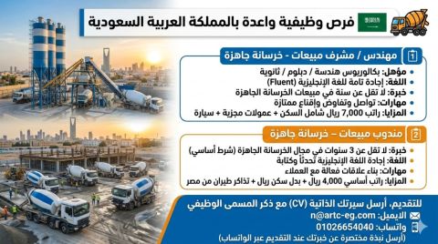 شاغر وظيفي لدى احدى كبرى الشركات في مجال الخرسانة الجاهزة بالمملكة العربية السعودية - الرياض "مهندس / مشرف مبيعات - خرسانة جاهزة" حاصل علي بكالوريوس هندسة أو ثانوية أو دبلوم يجيد اللغة الانجليزية بطلاقة (Fluent) خبرة لا تقل عن سنة في مجال المبيعات (Sales) خبرة سابقة في مجال الخرسانة الجاهزة مهارات تواصل ممتازة وقدرة على التفاوض والاقناع - الراتب 7000 ريال سعودي شامل السكن + عمولات مجزية حسب الأداء