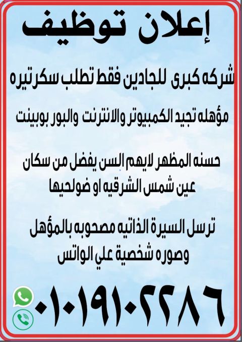 مطلوب سكرتيرة للعمل بشركة طاقة شمسيه للتواصل
