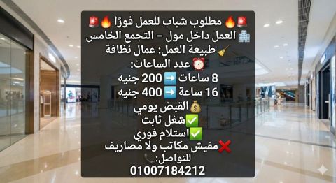 مطلوب شباب للعمل فورا في مول بالتجمع الخامس الوظيفة عمال نظافة القبض يومي مواعيد العمل 8 ساعات 200 جنيه 16 ساعة 400 جنيه شغل ثابت استلام شغل فوري مفيش مكاتب - مفيش نصب للتواصل
