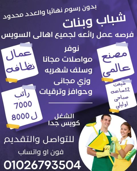 بشرى ساره للسوايسه لجميع أهالي السويس براتب 7000 ل 8000 صافي + مواصلات يوميا مجانا نطلب شباب وبنات عمال نظافة (شغل كويس جدا) طبيعة العمل نظافة منطقة العمل السويس حي الأربعين مكان التقديم السويس حي الأربعين شيفت 12 ساعة يوجد ساعة بريك صباحي وليلي المكان مصنع فاخر جدا في السويس المميزات سلف شهريه وفيزا للقبض اجازات سنويه وترقيات زي مجاني لائق مجانا يوم اجازة في الأسبوع لا يشترط مؤهل معين الجدية والالتزام