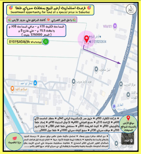 فرصة استثمارية أرض للبيع بمنطقة سبر باي طنطا داخل الحيز العمراني وكافة المرافق المساحة الكلية 270م - صافي المساحة 208م واجهة 15.5م على شارع 8م (السعر 3750000 جنيه) WhatsApp موقع الأرض بالنسبة للمواقع المحيطة شركة الكهرباء 250م طريق مصر الاسكندرية الزراعي 340م معهد الحاسب الآلي 400م الإزاعة 310م مصنع العيا شيء 450م الأحوال المدنية 490م إستاد طنطا والكورنيش 550م كلية الشريعة 300م مستشفى