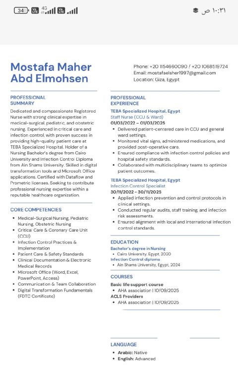 أنا طالب تمريض عندي 21 سنة ثانيه كلية لديه خبرة سنة في شغل الطوارئ وابحث عن عمل