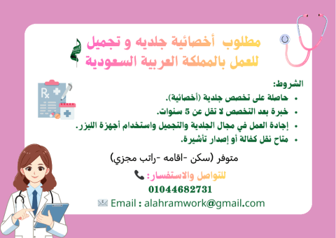 مطلوب دكتورة جلدية أخصائية للعمل بالمملكة العربية السعودية الشروط حاصلة على تخصص جلدية (أخصائية) خبرة بعد التخصص لا تقل عن 5 سنوات. اجادة العمل في مجال الجلدية والتجميل واستخدام اجهزة الليزر. متاح نقل كفالة أو اصدار تأشيرة. نقل - كفالة تأشيرة - عمل أطباء