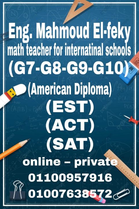 مم حمود الفقي ماث شرح المنهج الأمريكي (G6 - G7 - G8 - G9 - G10 - G11) للطلاب المصريين والعرب في أي مدرسة أمريكية في جميع أنحاء العالم مع تأسيس الطلاب وتجهيزهم لامتحانات الدبلومة الأمريكية (SAT & ACT & EST) وكذلك شرح المنهج البريطاني (IG (GCSE - OL - AL للمراحل (G8 - G9 - G10) Cambridge & Edexle الحصة الأولى مجانا والشرح أون لاين على برنامج زووم. للتواصل