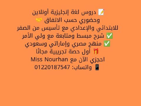 دروس لغة انجليزية اونلاين وحضوري حسب الاتفاق للابتدائي والاعدادي مع تأسيس من الصفر متاح أيضا الصف الأول والثاني الثانوي. شرح مبسط ومتابعة مع ولي الأمر منهج مصري واماراتي وسعودي أول حصة تجريبية مجانا