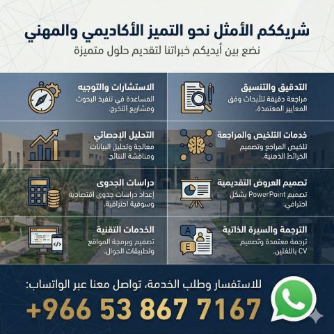 هل تبحث عن مساعدة احترافية لانجاز مهامك الدراسية أو مشاريعك العملية نحن هنا لنضع خبراتنا بين يديك نقدم لكم حزمة متكاملة من الخدمات المتميزة تدقيق وتنسيق مراجعة دقيقة للأبحاث وفق المعايير. استشارات وتوجيه مساعدة في البحوث ومشاريع التخرج. تحليل احصائي معالجة البيانات ومناقشة النتائج. ترجمة معتمدة وتصميم CV احترافي. خدمات تقنية تصميم مواقع وتطبيقات. دراسات جدوى وتصميم عروض تق
