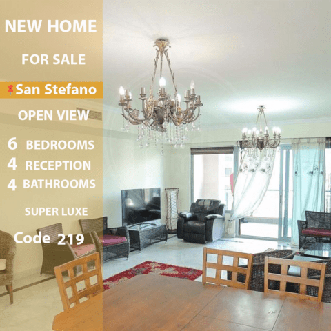 شقة للبيع 298م سان ستيفانو 4 سيذون 6 غرف، 2 ريسبشن، 4 حمام الدور 6، عمارة 36 دور تشطيب الترا سوبر لوكس شقة مرخصة، بناء 2010 كاملة عدادات عدد 4 مصعد فيو مفتوح علي البحر الكود 0219 - الوكيل/ روان محمود