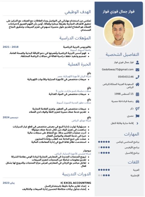 أنا خريج بكالوريوس تجارة شعبة محاسبه خبرة 3 سنوات مبيعات ومن ضمنهم سنة ونصف مسؤول فرع للاضاءة في السعودية في مؤسسة كبيرة للاضاءة وعندي خبرة كمبيعات الكهرباء وفي مجال الاضاءة كتوزيع اضاءة وتصميمها وتوزيعها في أماكنها الصحيحة وفنيات وتكنيك البيع وفنياته بحكم خبرتي في سيلز عقارات وادوية سنة ونصف آخرين في مصر وعلي علم ببرنامج أودو ونماسوفت وأعرف اعمل اعلانات في المملكة علي السوشيال أنا حاليا في مصر
