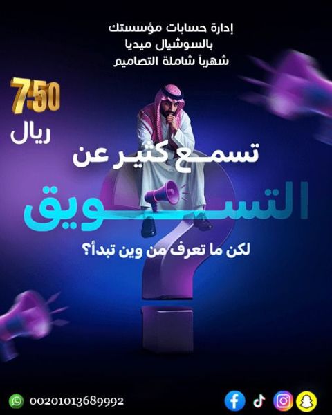 اذا مشروعك ما بان على السوشيال ميديا كأنكموا موجود خلك قدام وخلي خدماتك ومنتجاتك توصل لكل الناس وتكسر السوق وكل هذا ب 750 ريال بس إدارة شاملة لحساباتك شهر كامل، مع تصاميم، فيديوهات، محتوى وتسويق يخليك دايم متصدر وش بنسوي لك تصاميم وفيديوهات غير شكل محتوى يخلي متابعينك يتفاعلون معاك خطة تسويقية مدروسة + استهداف الصح متابعة يومية وتطوير مستمر والنتيج
