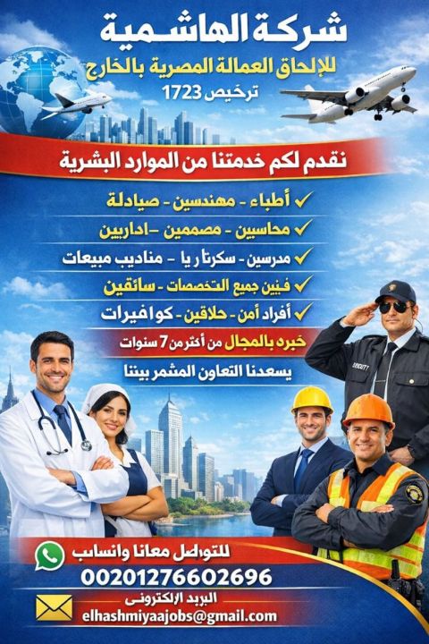 شركة الهاشميه ترخيص 1723. يسرنا أن نعرض عليكم خدماتنا / نوفر جميع المهن سائقين عمال (مهندسين جميع التخصصات) صيادلة) أطباء جميع التخصصات) ممرضين) محاسبين) مراجعين ماليين) مبرمجين) اداريين) سكرتارية) مشرفين) حراس أمن) مناديب مبيعات) خدمة عملاء) مراقبين حركة) طباخين) فنيين) وعلى أعلى مستوى جميع الأفراد لديهم خبرة في المجال وشهادات معتمد توفر الشركة استقدام ونضمن لكم كفاءة وخبرات العمالة لدينا