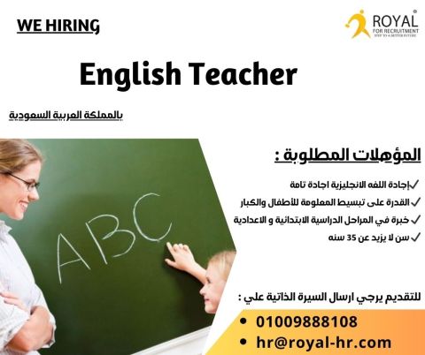 مطلوب مدرسة لغة انجليزية - English Teacher للعمل تابع لكبري شركات التوظيف بالمهندسين المؤهلات المطلوبة اجادة اللغة الانجليزية اجادة تامة - القدرة على تبسيط المعلومة للاطفال والكبار - خبرة في المراحل الدراسية (الابتدائية والاعدادية) سن لا يزيد عن 35 سنة - المميزات الإقامة - التأمين الطبي - السكن - المواصلات الداخلية للتقديم يرجى إرسال السيرة الذاتية مع كتابة "المسمي الوظيفي