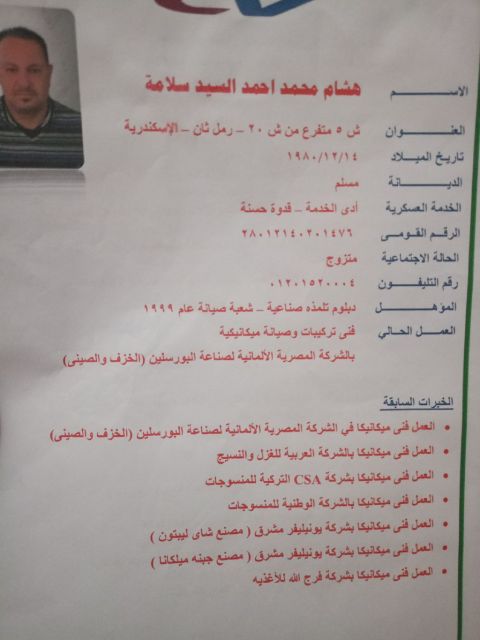There is a control technician who establishes and maintains factory equipment and establishes factories from the beginning and maintains all faults of electric motors and large water pumps. He has sufficient experience in establishing and maintaining control panels, the most complete ones and their derivatives, and a senior establishment and maintenance technician. Engineer Islam Abdel Hamid + is
