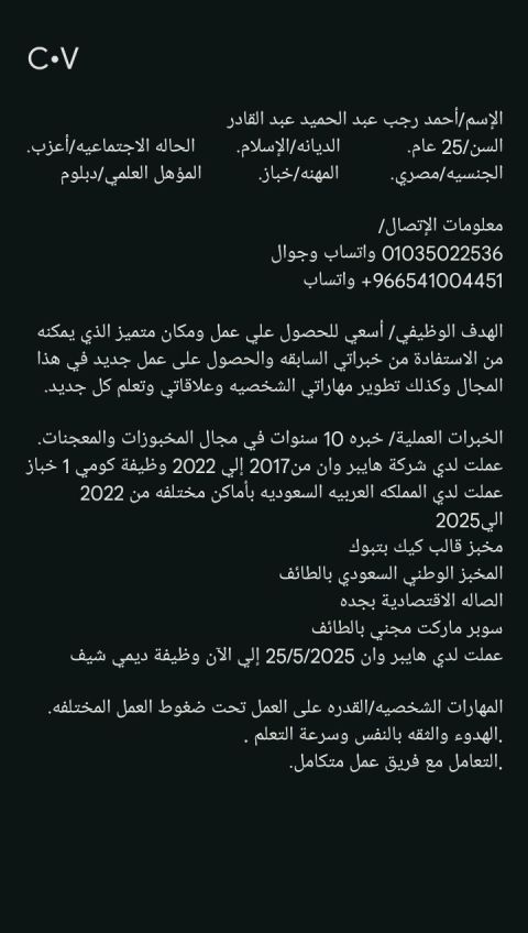 أنا أحمد، مقيم في مصر، معلم معجنات وبيتزا ومناقيش وكلذوني وصفيحة. ابحث عن فرصة عمل وسفر خارج مصر للعمل بها. اتمنى من الله ثم منكم أن يتواصل معي صاحب عمل اذا كانت هناك فرصة عمل متاحة. لدي خبرة لا تقل عن 20 عاما. لا أدخن، ملتزم بمواعيد العمل، ومتفان تماما وهادئ